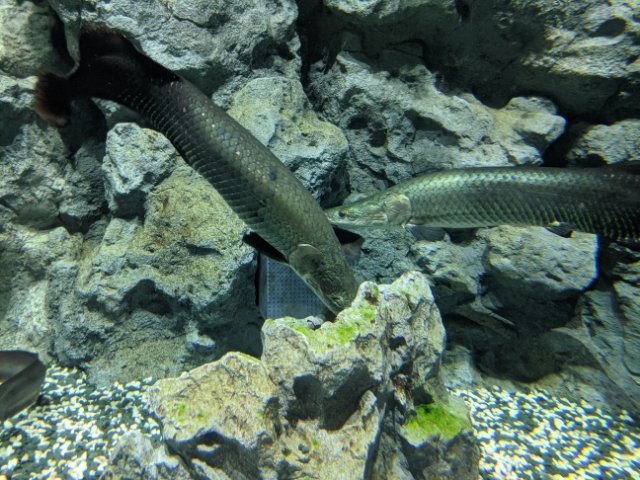 レッドテールキャットやシルバーアロワナなど、おなじみアマゾン系大型淡水魚は見ごたえ抜群。ピラルクもいますが、まだ少し小さめです。