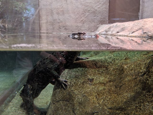 なんとワニも登場!ブラジルカイマンという小型のワニで、獲物を捕らえるとき以外はほとんど動くことは無いそうです。