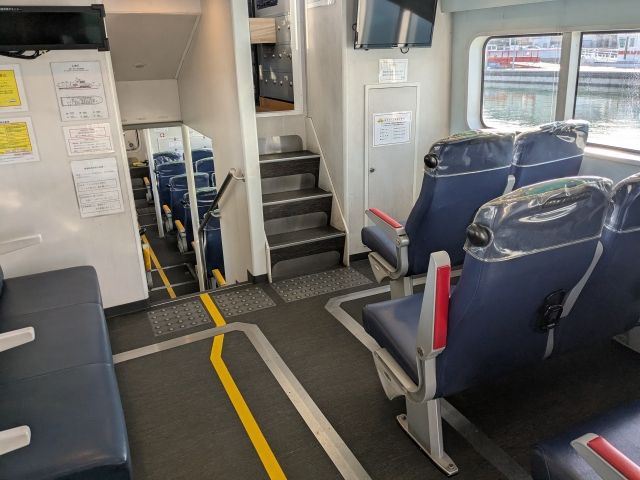 2019年就航の船で、船内はまだまだキレイ。各席にはコンセントもあるので、モバイルバッテリーだけでなく充電器の持参がおすすめです!