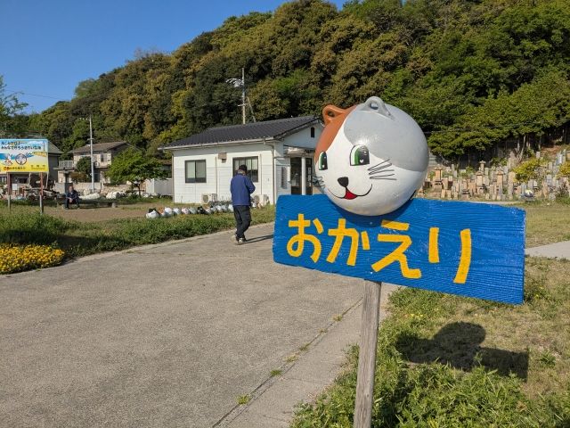 ずらりと並ぶネコのブイアート。その奥にある白い建物が待合室。自動販売機はありませんでした。