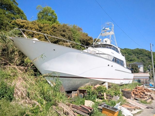 六島浜醸造所の先へ進むと、陸に揚げられている大きな船が。こちらはなんと20億円のクルーザー!詳しいことはわかりませんが、外観の見学は自由な様子。