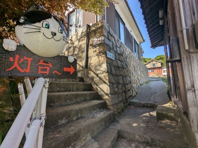 さて、灯台はどうやって行くのでしょうか?先ほどの六島浜醸造所の隙間に、灯台を示す案内がありました。
