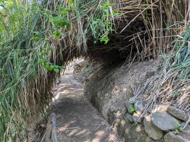 集落を出ると、軽めの山道へ。未舗装ですが整備されていて歩きやすい。途中には、トトロが出現しそうな草のトンネルも。