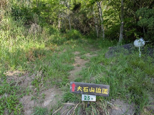 灯台の裏側へ進むと、「大石山近道」と記された案内板が。大石山は六島の中央にそびえる最高峰。「25分」という時間の表記も超ありがたいです。ということで、山登りスタート!