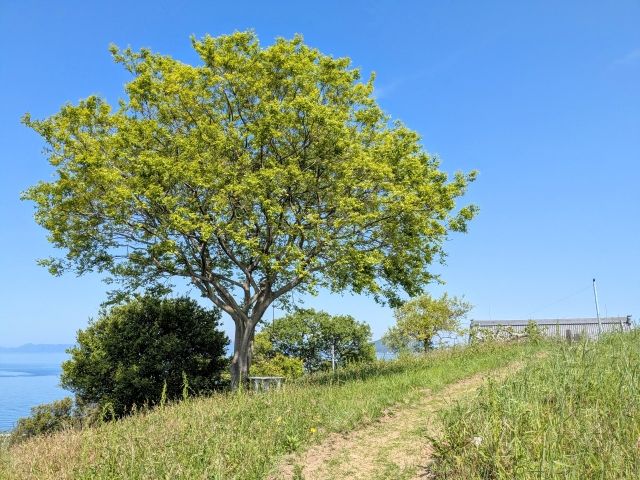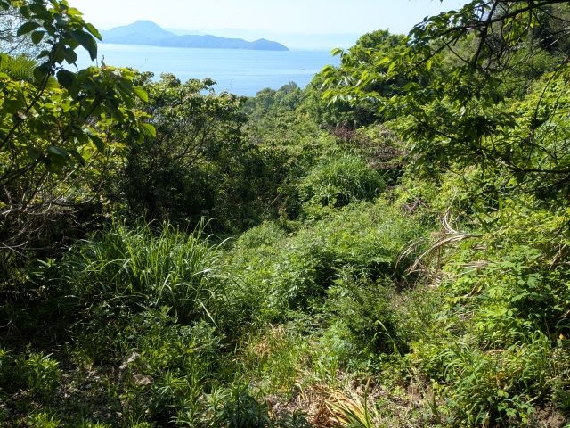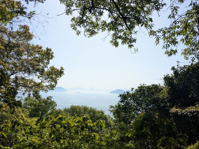 標高185mの山頂。木々が茂っているため爽快さはありませんが、木々の隙間から広がる青い海を見ていると疲れも吹き飛びます。