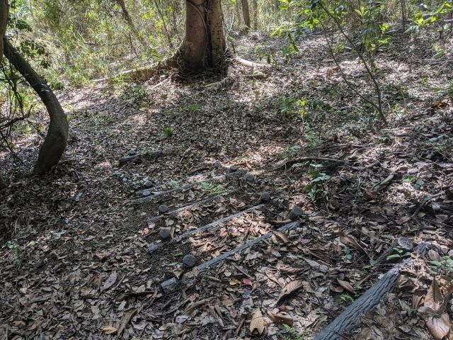 ピンクテープが見当たらず不安になりながら進みます。要所要所には、滑らないように段が作られているのでそれを目印に。ヒザを痛めないように注意しながら下っていきます。