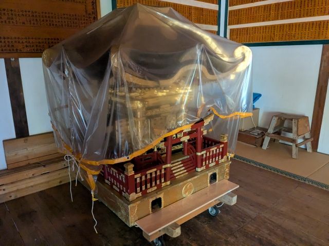 社殿内にはお神輿が安置されていました。ここでは毎年10月の第二土曜日・日曜に例大祭が行われています。「よーまっせ!」の掛け声ととまに神輿を激しく揺り動かして回す「回し神輿」が見どころとのこと。