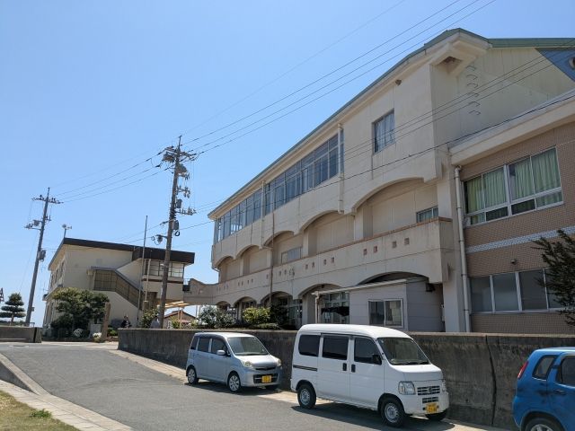港のすぐそばに立つ立派な建物は、2014年に閉校となった旧・飛島小中学校。