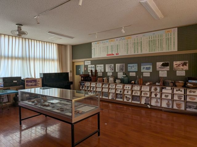 教室の一部屋は飛島歴史文化展示室となっており、無料で見学可能。発掘調査時の写真や、出土した土師器などが展示されております。