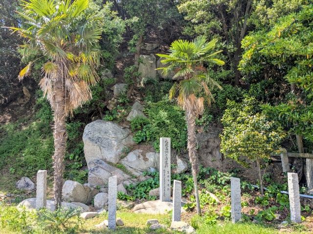 シュロの木の奥、山肌に沿って巨石が積み上がっています。ここは海上交通の安全を祈願した祭祀跡と考えられています。遣唐使派遣の際に、航海安全の祈願が行われた場所であったそう。さらに鎌倉時代には生活の場でもあったようです。
