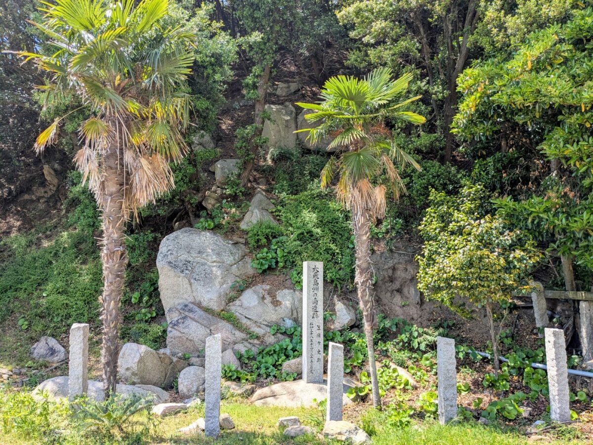シュロの木の奥、山肌に沿って巨石が積み上がっています。ここは海上交通の安全を祈願した祭祀跡と考えられています。遣唐使派遣の際に、航海安全の祈願が行われた場所であったそう。さらに鎌倉時代には生活の場でもあったようです。