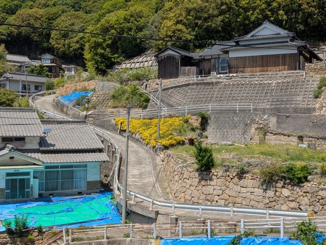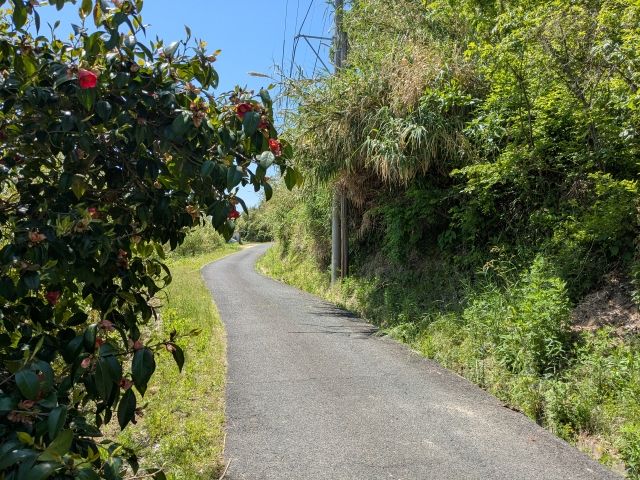 ハチマキ道路に戻りました。しばらく歩いてちょうど半分くらいに差し掛かると、大きめな集落が見えてきます。