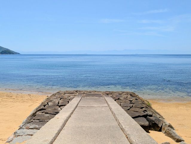 波穏やかな砂浜で、海水は透明度が高くめっちゃきれい。石積みの桟橋がとっても絵になります。