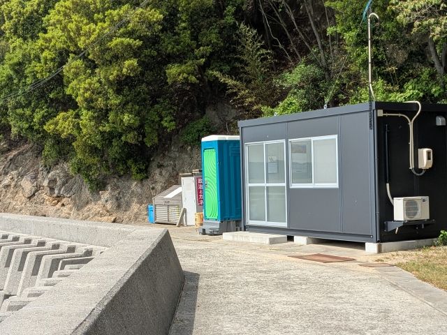 小飛島の港は、プレハブ待合室と仮設トイレがあるだけ。もちろん自動販売機はありません。