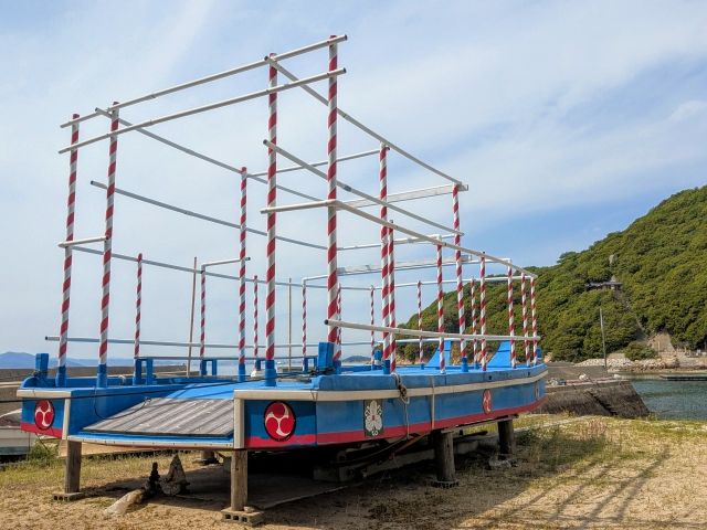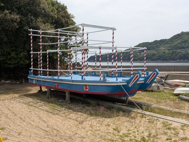 こちらは御召船といい、島神社のお祭りの際に使用される船。7月の海の日の三連休にて、さきほど島神社にあった御神輿を乗せて大飛島へと渡るそう!