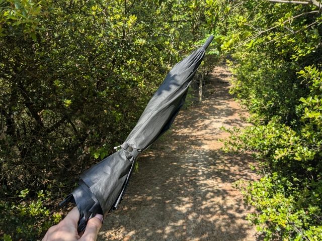 雨除け&日よけ&ポール替わりに持参している傘を使って、上手く回避していきます。この傘も、毛虫除けに利用されるなんて思いもしなかったことでしょう。