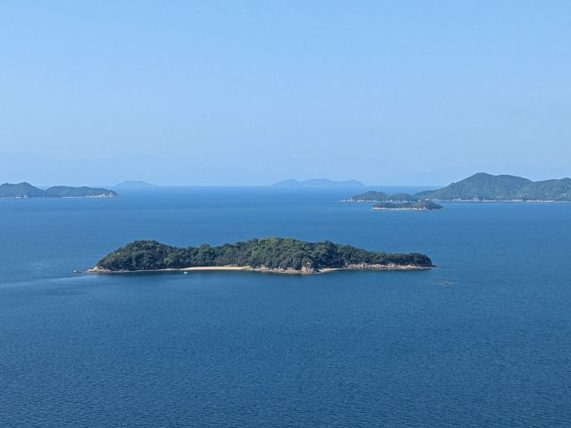 海に浮かんでいるのは、笠岡諸島の梶子島(かじこじま)。定期航路はありませんが、岡山県青少年の島となっている離島です。