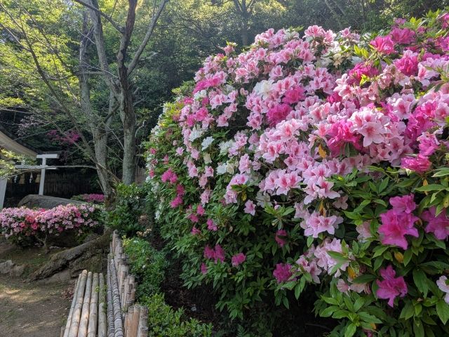 社殿の周りは園地となっておりツツジがたくさん!ここは誠山公園。飛龍大神の神徳に助けられた夫婦が感謝の気持ちを込めて作り上げた園地であるそう。サクラも多数植えられているそうです。