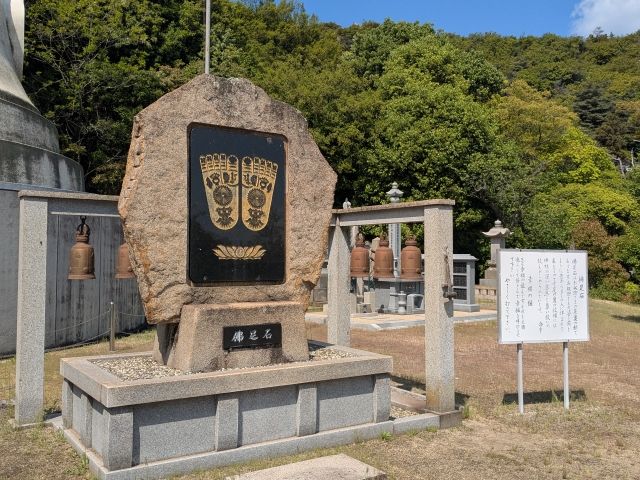 仏舎利塔のすぐそばには、佛足石。お釈迦様の足の裏の相であり、不思議な模様は深い慈悲と尊い救いの教えが込められているそう。側には3回叩くと幸せが訪れる幸福の鐘も設置されています。