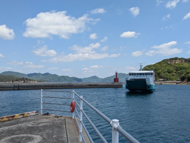 汽笛とともに入港してくるのはフェリー大福丸。さあ、次の島「北木島」へと向います!