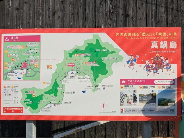 フェリーは寄港せず、三洋汽船の時刻表だけを見れば良いため計画はとってもスムーズ。真鍋島には「岩坪港」「本浦港」という2つの港がありますが、この2港の距離は1km徒歩20分ほど。2港の間には見どころである八幡神社もあるので、片方で降りてもう片方の港へ抜ける散策コースが良さそうです。