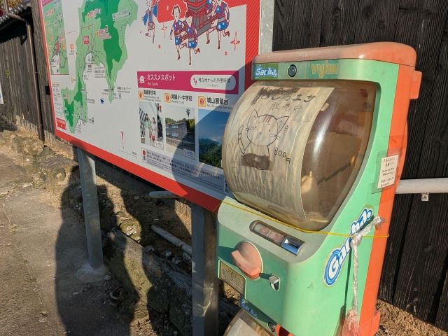 数が減っているというウワサもありましたが、本浦港周辺には多数のネコの姿が。港付近にはエサガチャも設置されております。