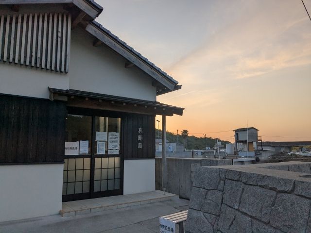 わずか8分で真鍋島の本浦港に到着。待合室、めっちゃきれいなトイレ、コカコーラの自販機があります。