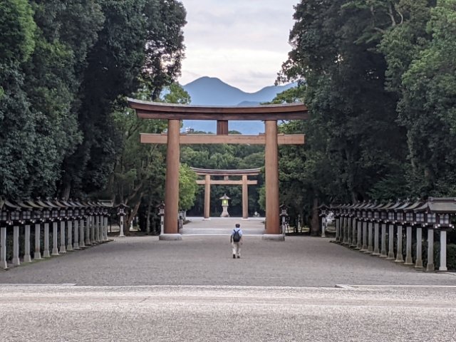 高さ10mにも及ぶ立派な一の鳥居をくぐると、100mの表参道が広がります。砂利が敷き詰められており、歩くたびにジャッジャッという音が響きます。夕暮れの訪問だったため、参拝客もまばら。静かな境内は荘厳な雰囲気。