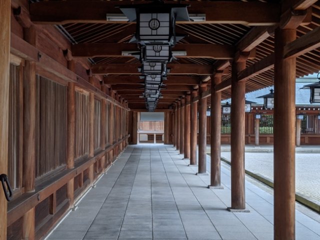 外拝殿から内拝殿までは外院斎庭が広がっており、その周りを廻廊が取り囲んでいます。等間隔に並べられた柱と燈籠がとても美しい。