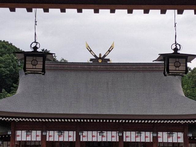 拝殿の奥にあるのは本殿。この千木は本殿の屋根が見えているのかと思いきや、本殿の手前にある幣殿のものとのこと。