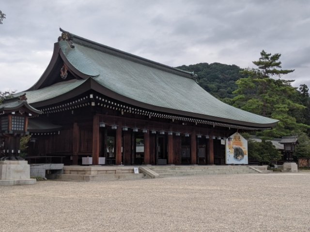 参道を抜けて、南神門を抜けると、広々とした空間に建つ大きな建築が見えてきます。こちらは昭和14年に完成した外拝殿(げはいでん)。向かって右側には、幅5m以上の巨大な絵馬も置かれています。