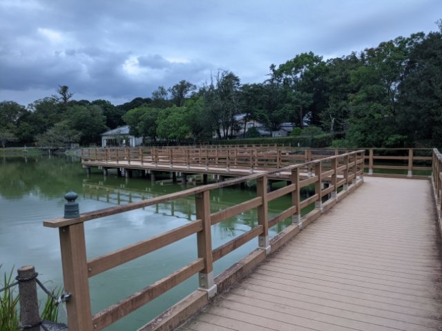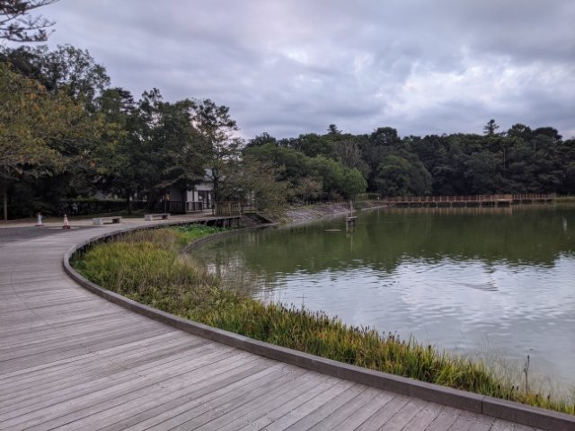 池の周囲には遊歩道がつくられており、中央には対岸へと渡るウッドデッキも設けられています。神宮閉門後もこちらは出入り自由となっており、夕暮れの中集まって話す人々やウォーキングしている人の姿が。まるで公園のように長閑な雰囲気です。