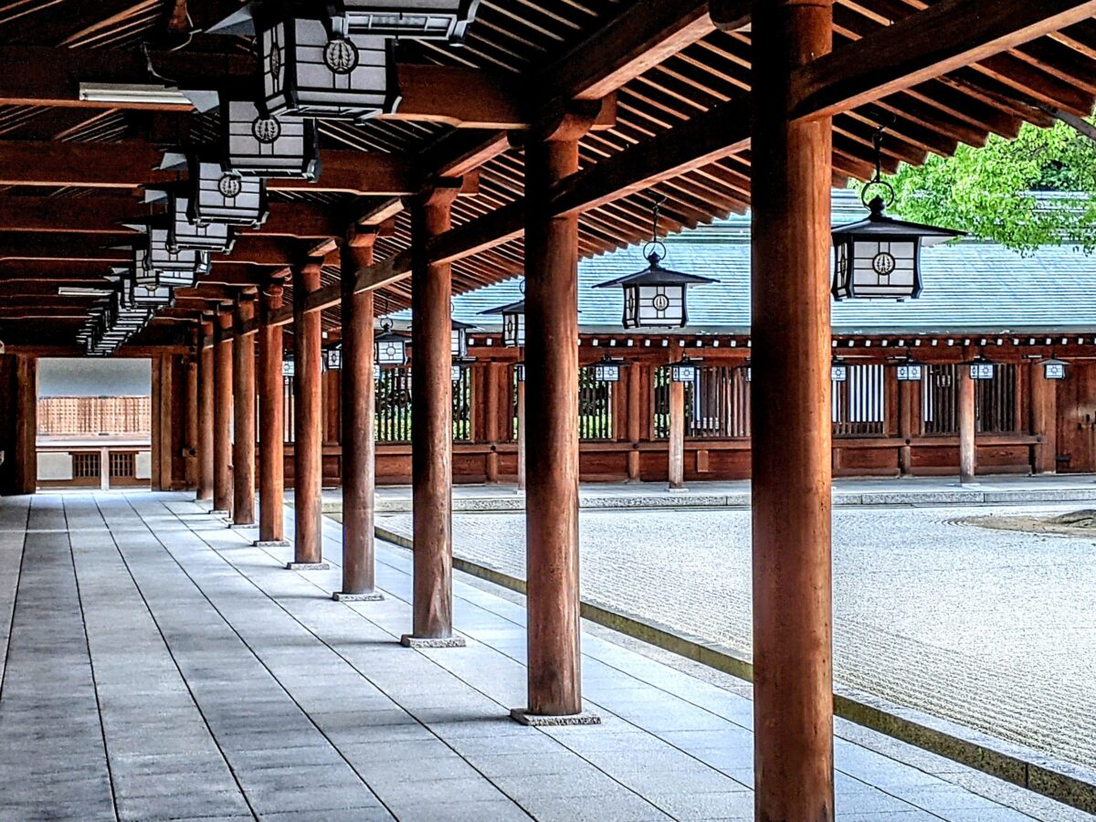 外拝殿から内拝殿までは外院斎庭が広がっており、その周りを廻廊が取り囲んでいます。等間隔に並べられた柱と燈籠がとても美しい。