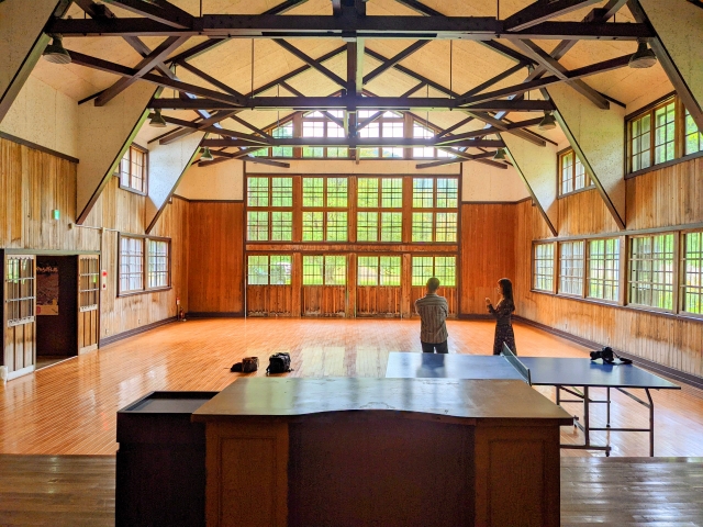 体育館を見渡すと、片隅にはバレーボール、バトミントン、卓球台などの遊び道具がたっぷり。どうやら自由に遊んでも良いそう…!うわー、久しぶりに体育館で遊びたいっ!と思ったのですが、今回もまたいつもながらの一人旅。遊び相手がいないぼっちなので、謎に寂しくなりました。