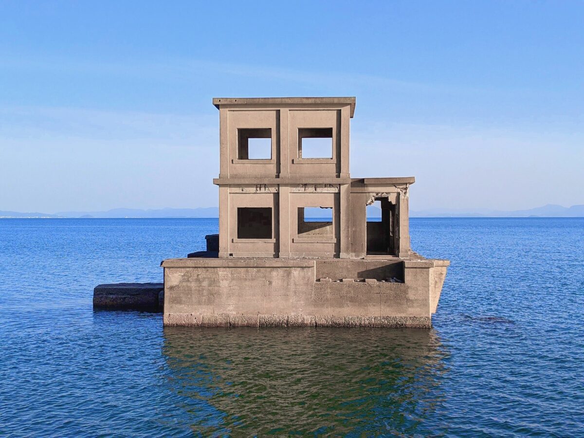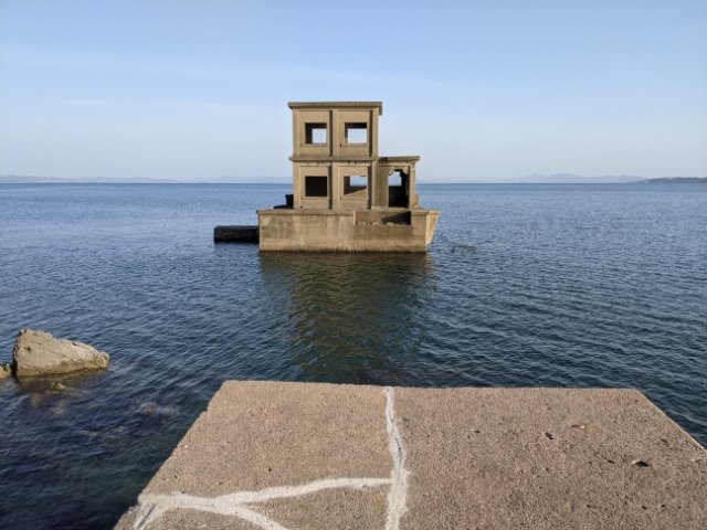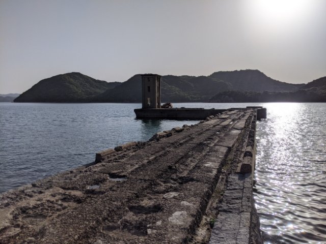 海に向かって伸びるコンクリートの橋。その先に何か建物の跡のような廃墟がそびえています。