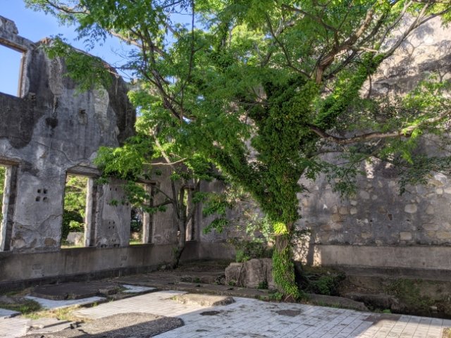 屋根の無い壁だけの建築物で、日当たりは抜群、風通しも最高な優良物件です。太陽の光がさんさんと降り注ぐ中で、植物たちが元気に育ち、コンクリートの無機質な世界を彩っています。葉が茂る新緑の季節にこそ訪れたい場所です。