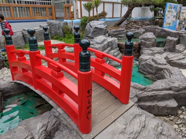 はりまや橋のようなこの橋は「かつらやばし」。橋の下は日本庭園風の池になっているのですが、そこを泳ぐのはコイではなく海水魚。なんだか違和感たっぷりな展示です。
