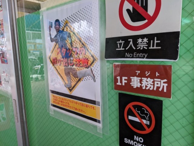 展示もユニークですが、見逃してはいけないのが園内各所の貼り紙。どれも普通ではない面白ネタが詰まっています。例えばスタッフルームの表示も「事務所(アジト)」と一捻り。「スタッフの飛び出し注意」との注意書きも書かれています。