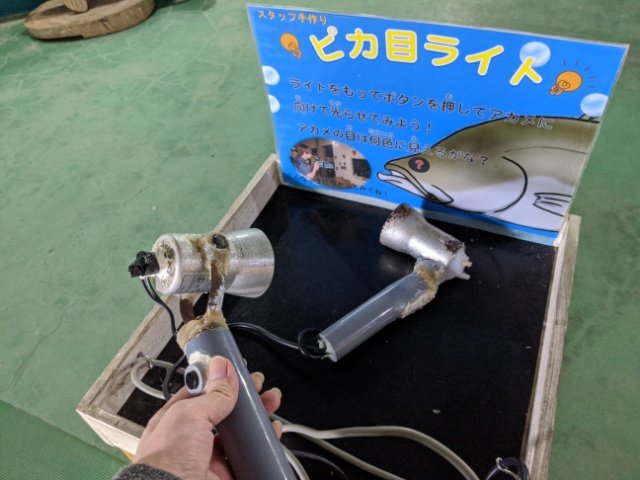それでもぜひ赤く光るところを見てみたい、そんな方のためにハマスイでは水槽の近くにはアカメ用のライト、その名も「ピカ目ライト」が設置されています。少し離れた位置にあるこのライトを水槽に向けると、アカメの目が赤く光る姿を見ることができます!