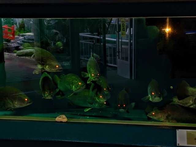 試しにカチッと付けてみると、水槽のアカメ全員の目が一気に真っ赤に!これはちょっとホラーな光景。