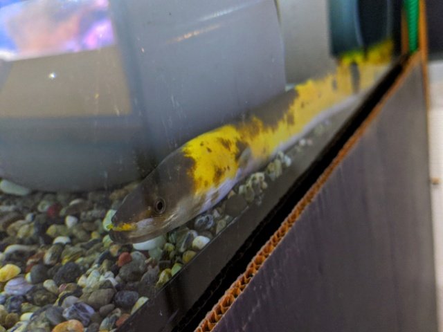 キリン柄のウナギ・モヨウモンガラドオシかと思いきや、ニホンウナギの色彩変異。このような模様になるのは10万匹に1匹という、どこぞのガチャもびっくりなレア具合。幸せを呼ぶウナギと呼ばれています。