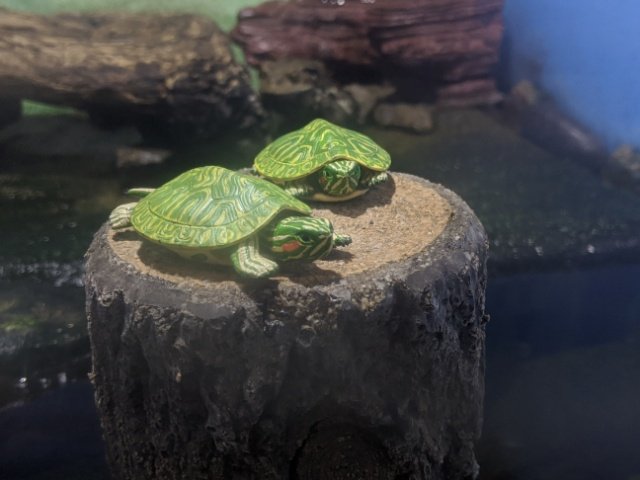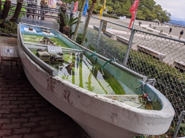 なんと、こちらのボートも水槽。泳いでいるのはカメ・カメ・カメ。ボートの形をうまく利用して陸地が造られていたりと、工夫が見えて面白いです。
