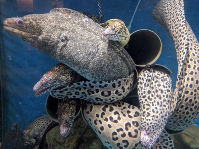 ニセゴイシウツボやアミメウツボなどてんこ盛りのウツボたち。ここではもう結び目ができそうなくらい濃厚に絡まってます。