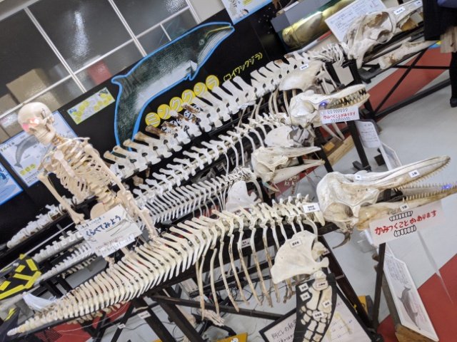 並んでいるイルカの骨と人間の骨。実際の標本に触ることができる体験コーナーなのですが、この骨たちは突然動き出します!しかも目が光ります!いきなり動くので、どっきりみたいなテンションです。