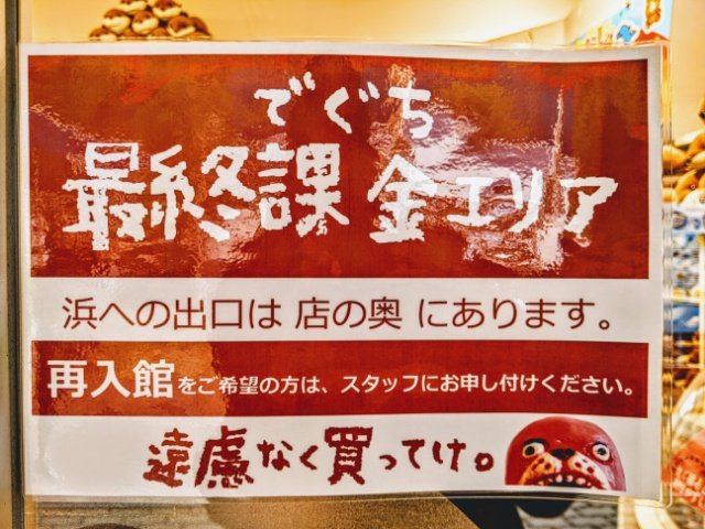水族館恒例の出口付近にあるショップ。水族館の限定グッズやぬいぐるみ、お土産ものなどが並ぶコーナーですが、入口にはこちらの案内が・・・。