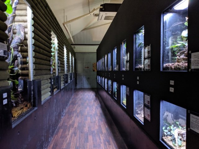 館内にズラリと並んだ水槽には、様々な種類のカエルたちが暮らしています。