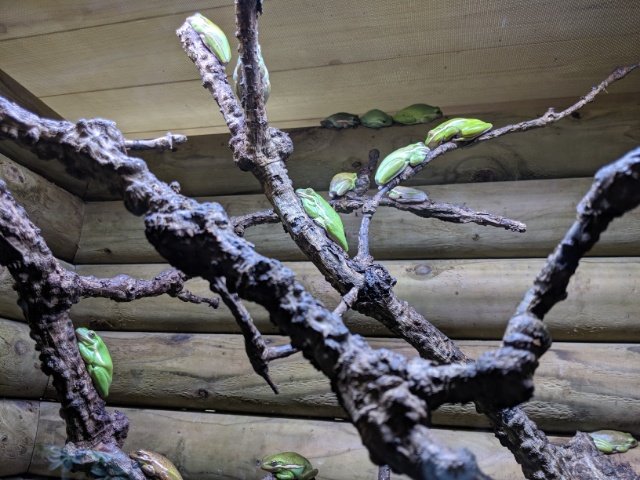 水槽のあちこちに散らばっているアメリカアマガエル。てかてかスベスベのボディが悩ましいカエルです。体長は6cmと日本で見ることができるアマガエルに比べるとかなり大きく見えます。