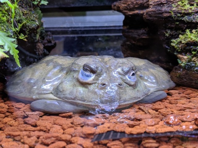 こちらは世界最大のカエル、ゴライアスガエル。体長は20cm以上、脚を伸ばすと80cm近くになることもあるそう。跳躍力も強く、なんと2m以上飛ぶことができるらしいです。このサイズがとびかかってきたら、カエル嫌いでなくても叫び声をあげてしまうことでしょう。