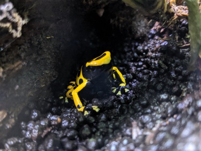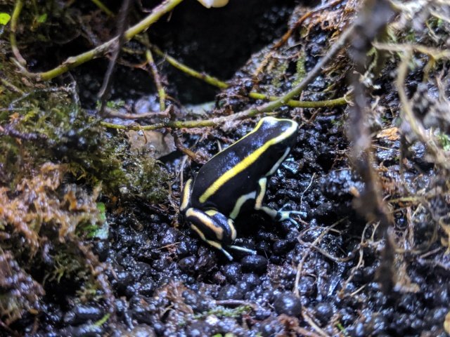 黒字に黄色いラインのリンカクヤドクガエル。どことなくダークヒーロー感があります。