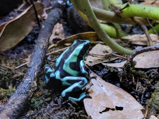 黒地にメタリックブルーという中二心をくすぐるマダラヤドクガエル。地域によって、黒&黄色や赤褐色&緑など様々なバリエーションが存在するらしいです。